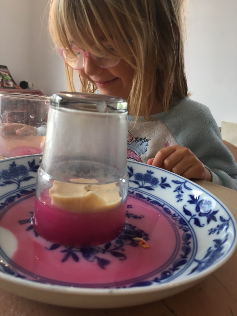 Cette expérience est basée sur le principe selon lequel l’air chaud ou les gaz de combustion chauds occupent plus d’espace que l’air ou les gaz froids. Lorsque le verre est placé sur la bougie, son intérieur est rempli de gaz de combustion chaud. Quand la bougie s’éteint, ces gaz se refroidissent et utilisent alors moins de volume. Un vide est créé, qui aspire ensuite l’eau à l’intérieur du verre.